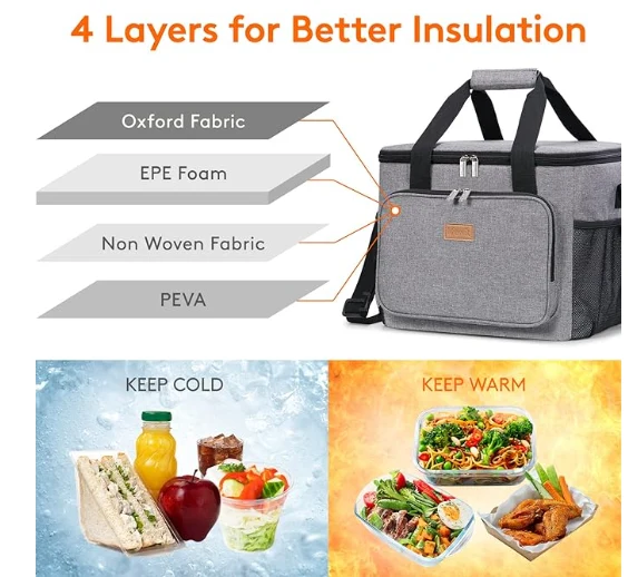 ਇੰਸੂਲੇਟਡ ਪਿਕਨਿਕ ਬੈਗ, ਦੁਪਹਿਰ ਦੇ ਲੰਚ ਦਾ ਬੈਗ ਇਨਸੂਲੇਟ ਕੀਤੀ ਗਈ ਸਮੱਗਰੀ ਦਾ ਬਣਿਆ ਹੋਇਆ ਹੈ ਜੋ ਭੋਜਨ ਨੂੰ ਰੱਖ ਸਕਦਾ ਹੈ ਅਤੇ 5 ਘੰਟਿਆਂ ਤੋਂ ਵੱਧ ਸਮੇਂ ਲਈ ਠੰਡਾ ਜਾਂ ਗਰਮ ਹੋ ਸਕਦਾ ਹੈ. ਇਸ ਤੋਂ ਇਲਾਵਾ, ਅੰਦਰੂਨੀ ਪਰਤ ਫੂਡ ਗਰੇਡ ਪੇਵਾ ਫੁਆਇਲ ਦੀ ਬਣੀ ਹੈ ਇਸ ਲਈ ਤੁਸੀਂ ਬਿਨਾਂ ਕਿਸੇ ਚਿੰਤਾ ਦੇ ਆਪਣੇ ਭੋਜਨ ਨੂੰ ਬੈਗ ਵਿਚ ਪਾ ਸਕਦੇ ਹੋ. ਬਿਲਟ-ਇਨ 6 ਐਮ ਐਮ ਈਪੀਈ ਝੱਗ ਤੁਹਾਡੇ ਡੱਬਿਆਂ, ਖਾਣ ਪੀਣ ਪੀਣ ਦੀਆਂ ਬਹੁਤ ਸੁਰੱਖਿਆ ਪ੍ਰਦਾਨ ਕਰਦਾ ਹੈ.