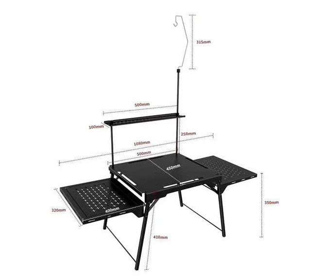 ਪੋਰਟੇਬਲ ਫੋਲਡਿੰਗ ਅਲਮੀਨੀਅਮ-ਆਇਰਨ ਕੈਂਪਿੰਗ ਟੇਬਲ, ਡਾਇਨਿੰਗ ਟੇਬਲ ਪਲੇਟਫਾਰਮ ਅਪਰ, ਮਿਡਲ ਅਤੇ ਹੇਠਲੇ ਹਿੱਸਿਆਂ ਦਾ ਬਣਿਆ ਹੋਇਆ ਹੈ, ਹਰ ਕਿਸਮ ਦੇ ਟੇਬਲਵੇਅਰ, ਭੋਜਨ ਅਤੇ ਦਾਲਾਂ ਨੂੰ ਸਟੋਰ ਕਰਨ ਲਈ ਕਾਫ਼ੀ ਜਗ੍ਹਾ ਦੇ ਨਾਲ.